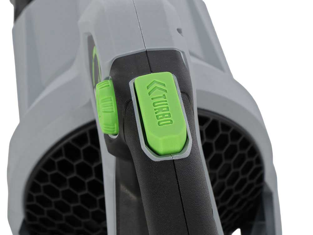 Controlli: grilletto a velocità variabile, selettore 200–480 CFM (USA) / 340–815 m³/h (EU), pulsante Turbo/Boost, blocco grilletto.